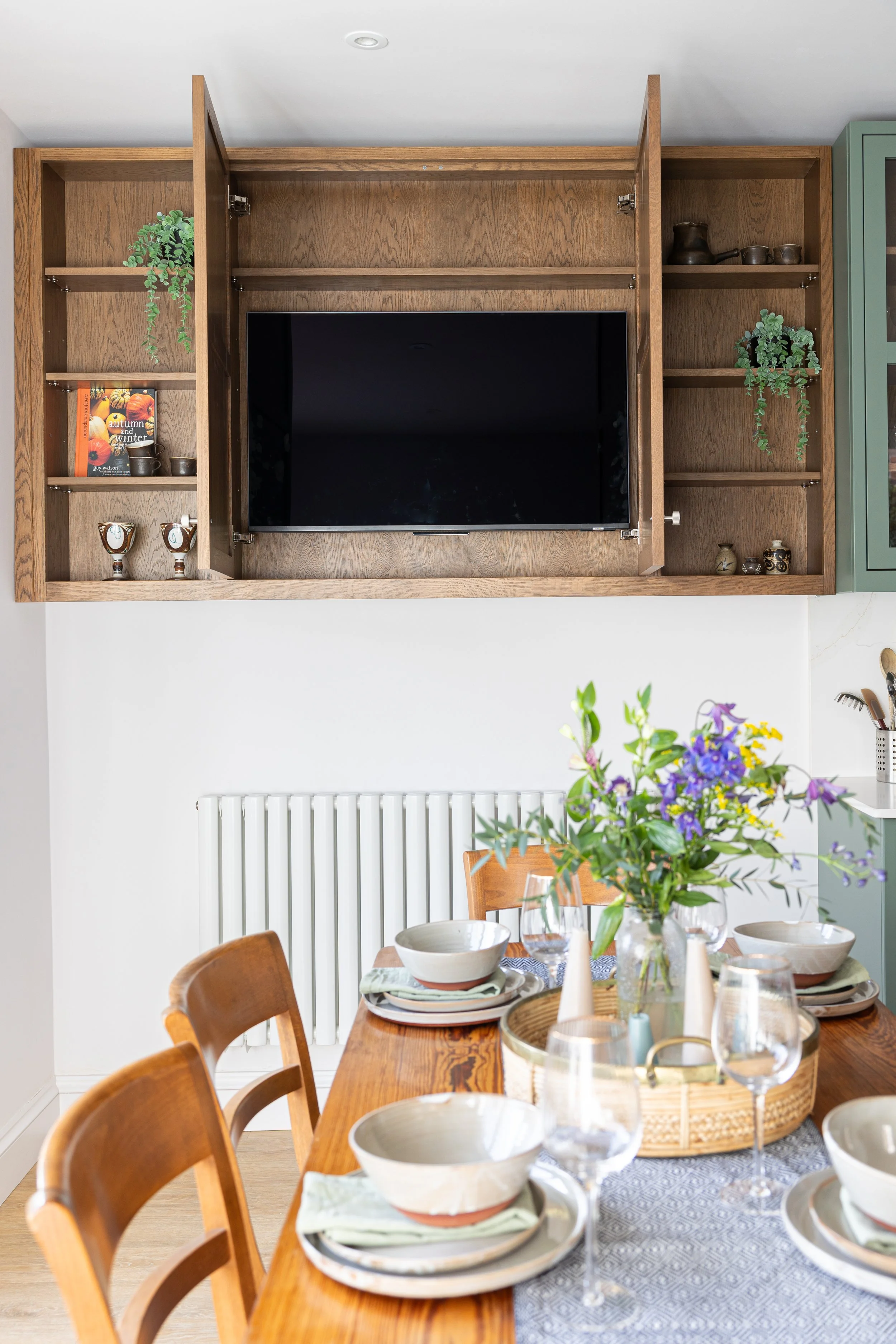 Victoria Rd.  Pair of alcove cabinets. Contemporary shaker style. Walnut veneer interiors.  TV cabinet.  Log store. Opening top cabinet to allow access to utilities. Floating shelves.  Hand painted in satin white.