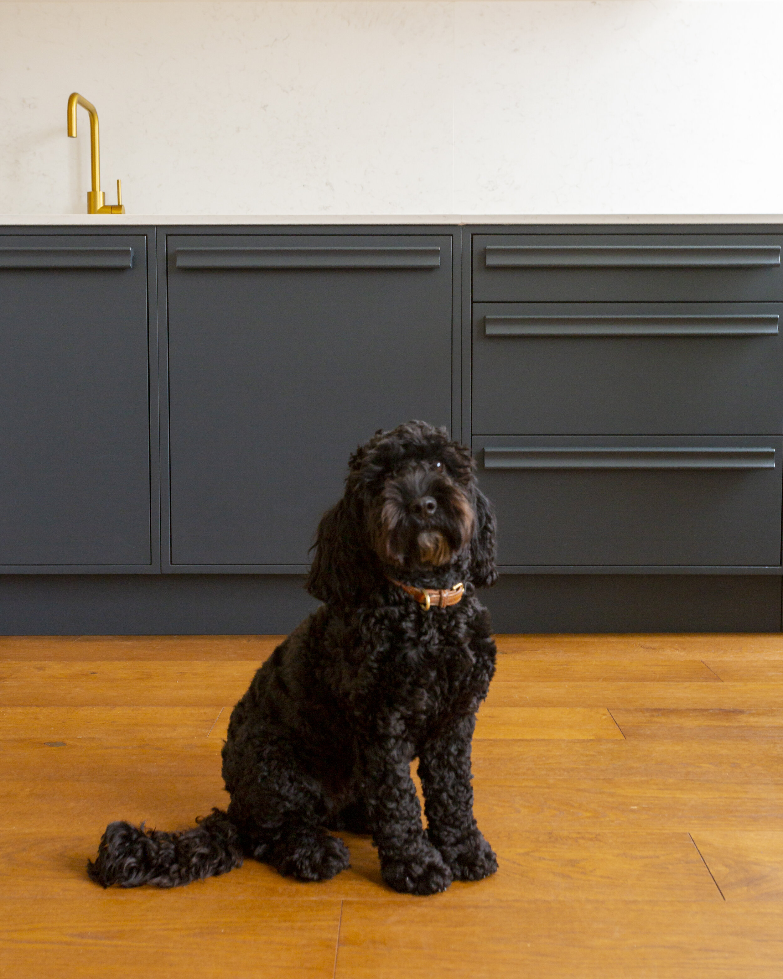 Scarborough Rd.  Handmade in frame kitchen. Farrow & Ball Railings and Birch Ply.  Slab doors.  Custom handles made in solid maple. Ft. Poppy the cockapoo.