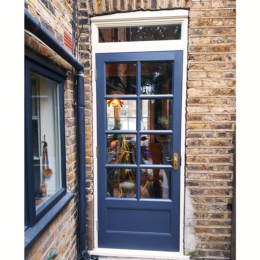 Vallentin Rd.  Bespoke ten pane glazed back door with top light. Hand painted in Farrow and Ball Off Black.  View fullsize