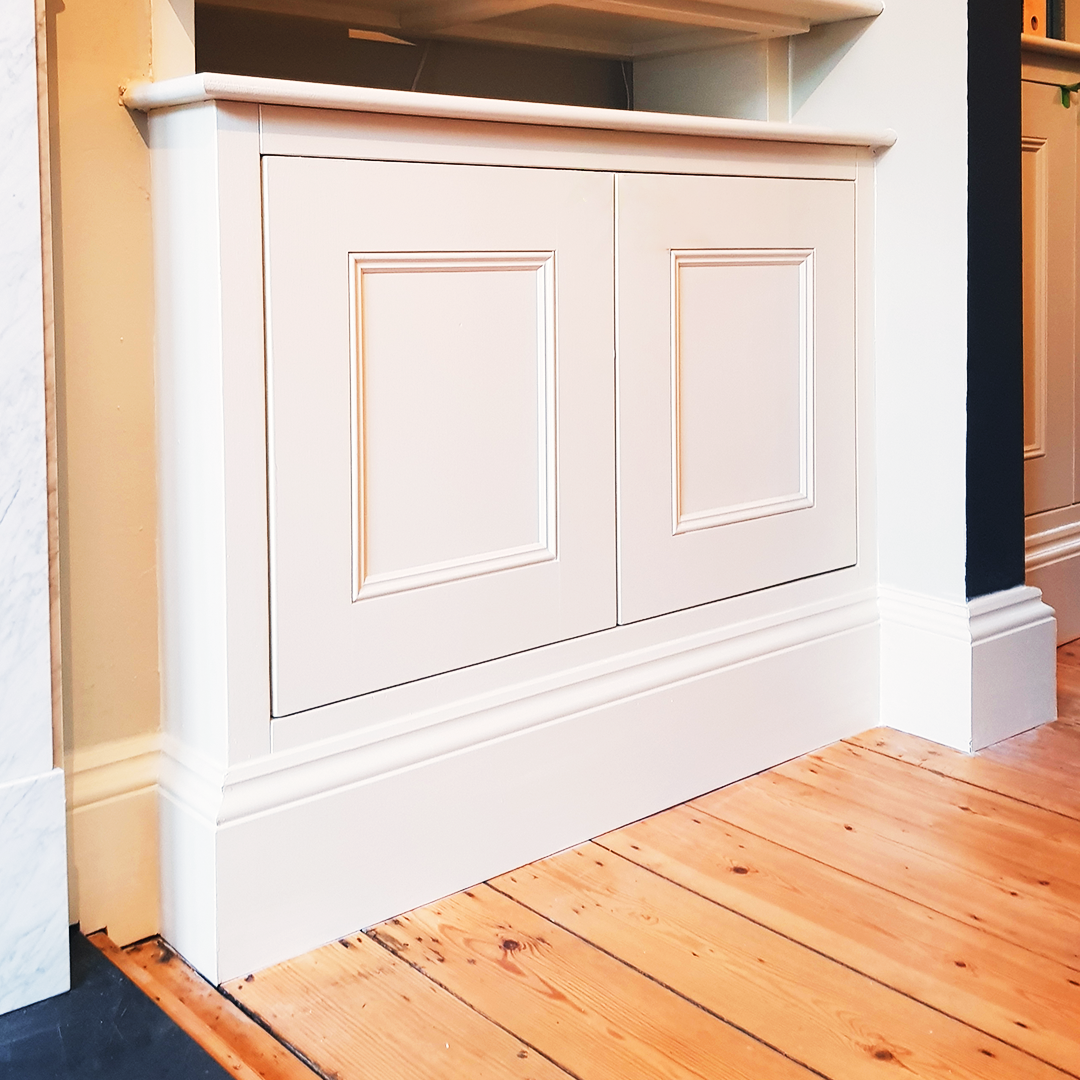 Vallentin Rd.  Traditional alcove cabinet with Victorian detailing.  Hand painted in Farrow and Ball Off White.